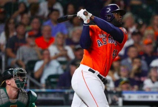 The 25-year-old Cuban professional baseball designated hitter and left fielder hit three monster home runs to help the Houston Astros past the Oakland Athletics 5-0.